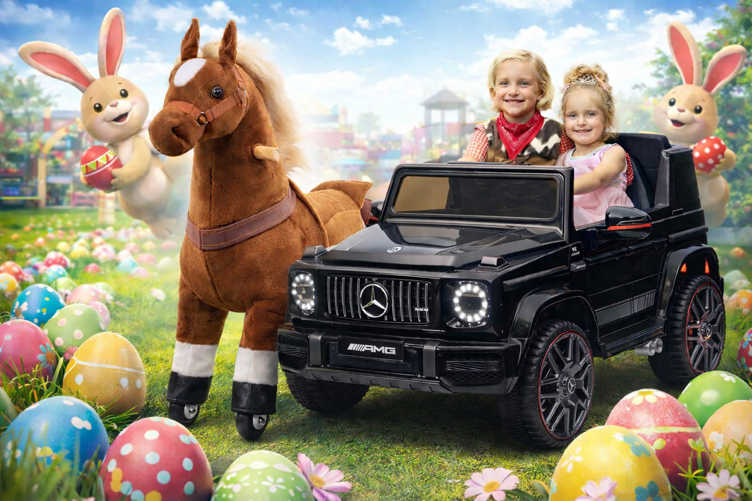 Der Gewinner darf wählen zwischen einem tollen Kinder-Reitpferd auf Rollen oder einem coolen Elektro-Kinderauto