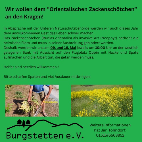 Im FFH-Gebiet rund um den Burgstetten bei Niemberg Brachstedt breitete sich das Orientalische Zackenschötchen aus und bedroht die heimische Flora. Wir möchten dagegen vorgehen und die Ausbreitung eindämmen.